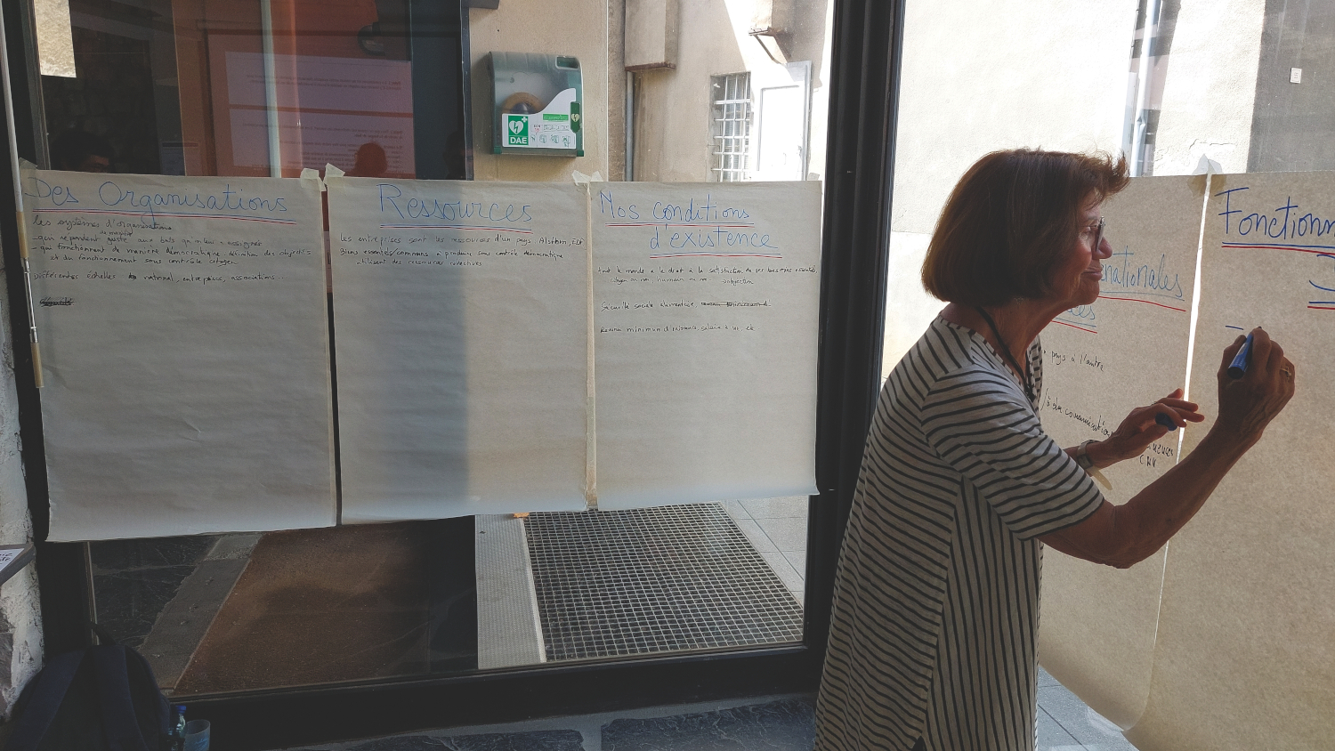 Elles les ont inscrits au gros feutre sur des feuilles A5 pliées en deux distribuées préalablement, puis elles ont été invitées à venir les présenter brièvement au groupe en les accrochant sur deux fils à linge tendus dans la salle. Elles ont également été invitées à expliquer en quelques mots comment elles avaient défini ce qu'étaient leurs besoins essentiels.